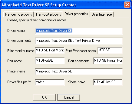 This page allows you give your own names to driver components. Driver name, Driver comments, Print monitor name, Port name, Port comments, Printer name, Print Processor name and Share name